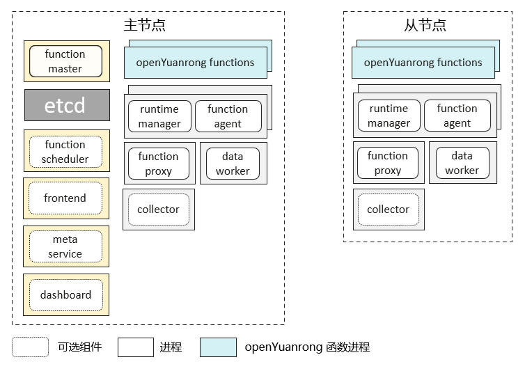 openYuanrong 集群由主节点和从节点组成。主节点默认只部署一个,在高可靠场景下,也可按主备方式部署多个。从节点可以部署任意多个,它由主节点管理。openYuanrong 组件和用户函数以进程的方式运行在节点上。