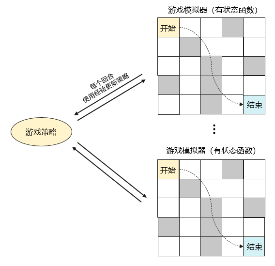 我们使用多个 openYuanrong 有状态函数实例来模拟迷宫游戏并记录游戏经验,这些经验值用于更新游戏策略。更新后的策略在下个回合的模拟游戏中继续使用,不断循环优化。