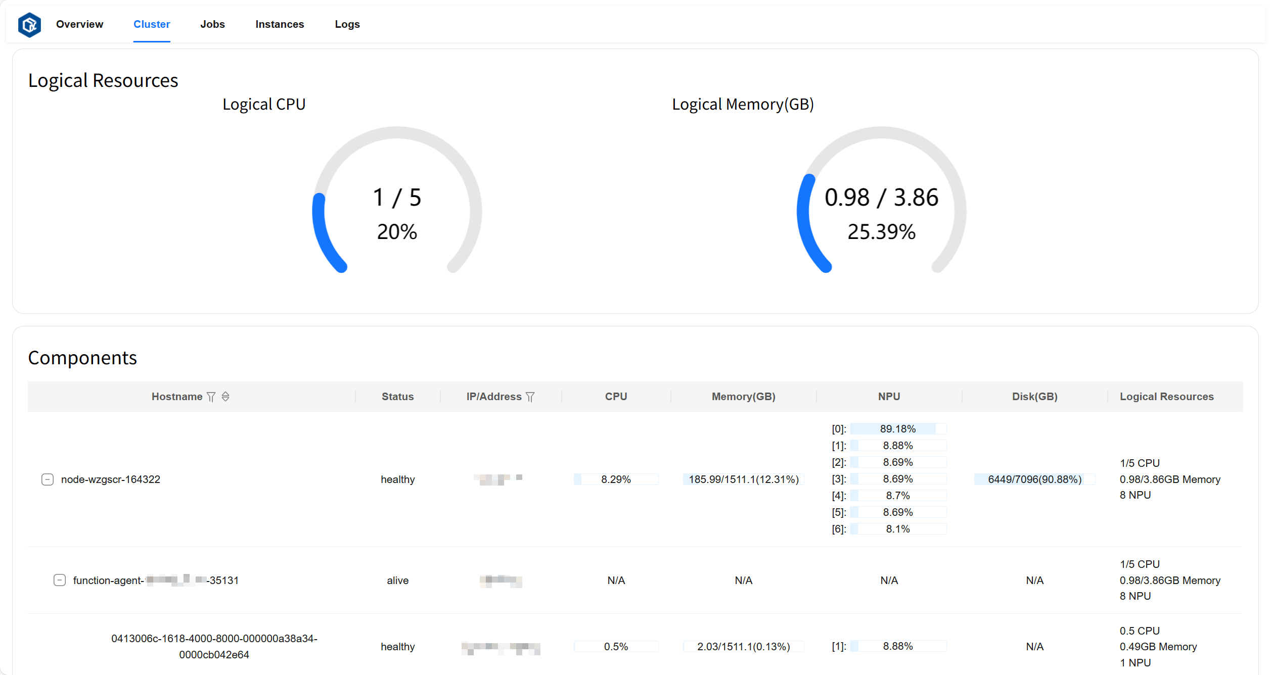 组件卡片(Components)展示了节点(node)的状态、地址、CPU 和 NPU 占用率、Memory/Disk/Logical Resources 各指标的使用量、总量及占用率;运行在对应节点上的代理(agent)的状态、地址、Logical Resources 指标的使用量、总量及占用率;运行在对应代理上的实例(instance)的状态、地址、CPU 和 NPU 占用率、Memory/Logical Resources 各指标的使用量、总量及占用率。