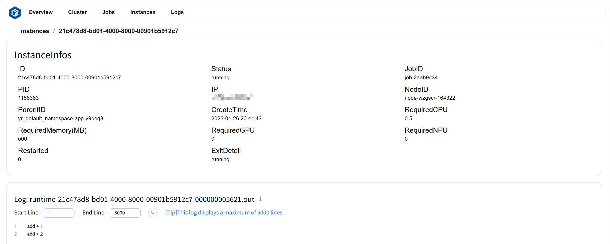 点击 ID 或 log 跳转至实例详情页。其中实例详情卡片(InstanceInfos)展示了此实例的详细信息,日志卡片(Log)显示此实例的日志和错误信息。