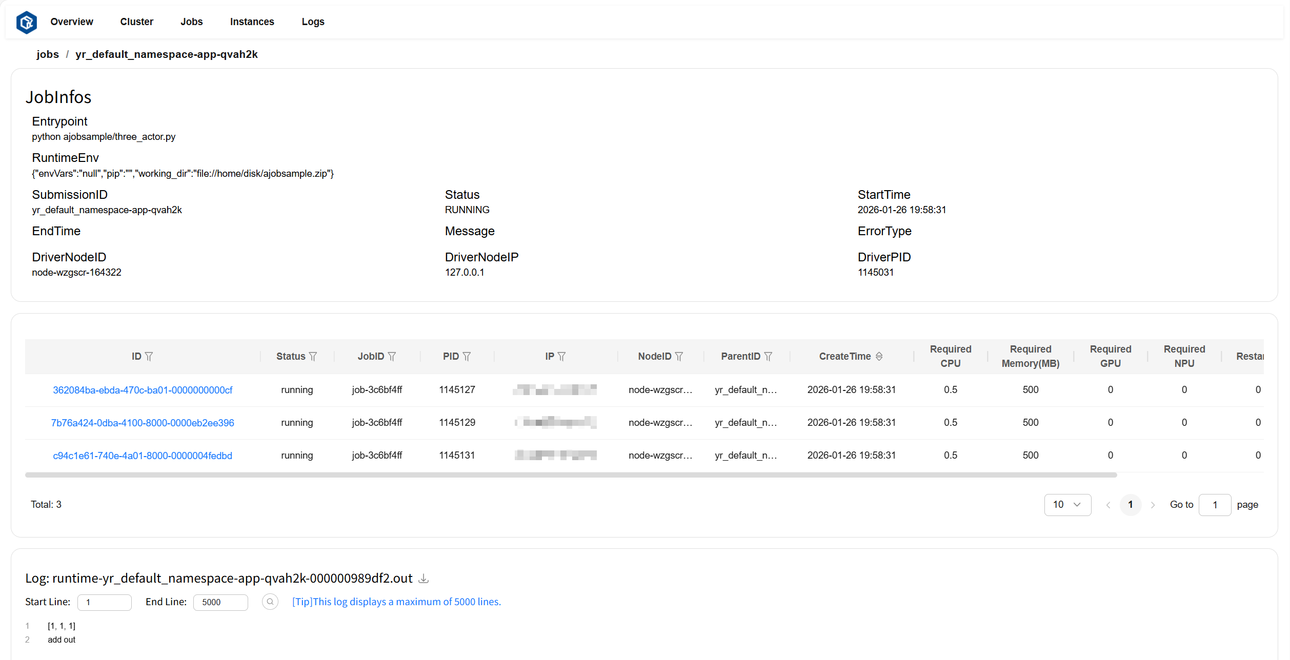 点击 SubmissionID 或 log 跳转至此作业的详情页。其中作业详情卡片(JobInfos)展示了此作业的详细信息,实例列表卡片展示了此作业包含的实例信息,日志卡片(Log)显示此作业的日志和错误信息。