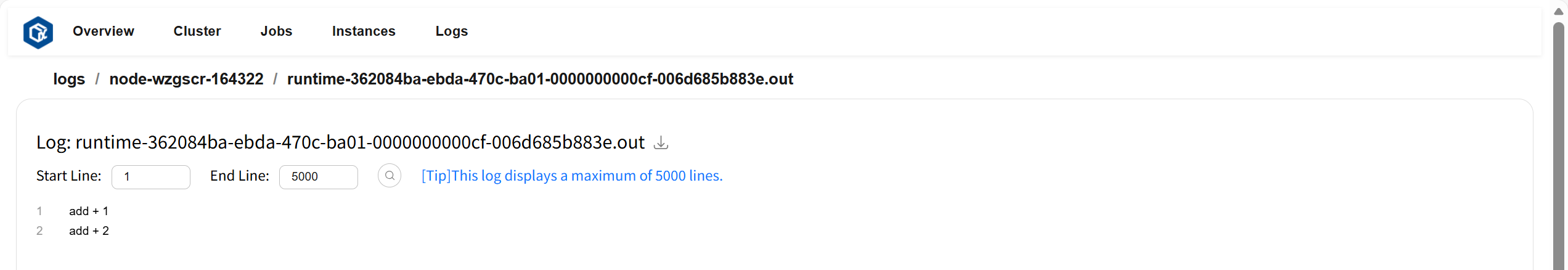 Logs 页面可以查看和下载所有日志内容和错误信息。页面示例: