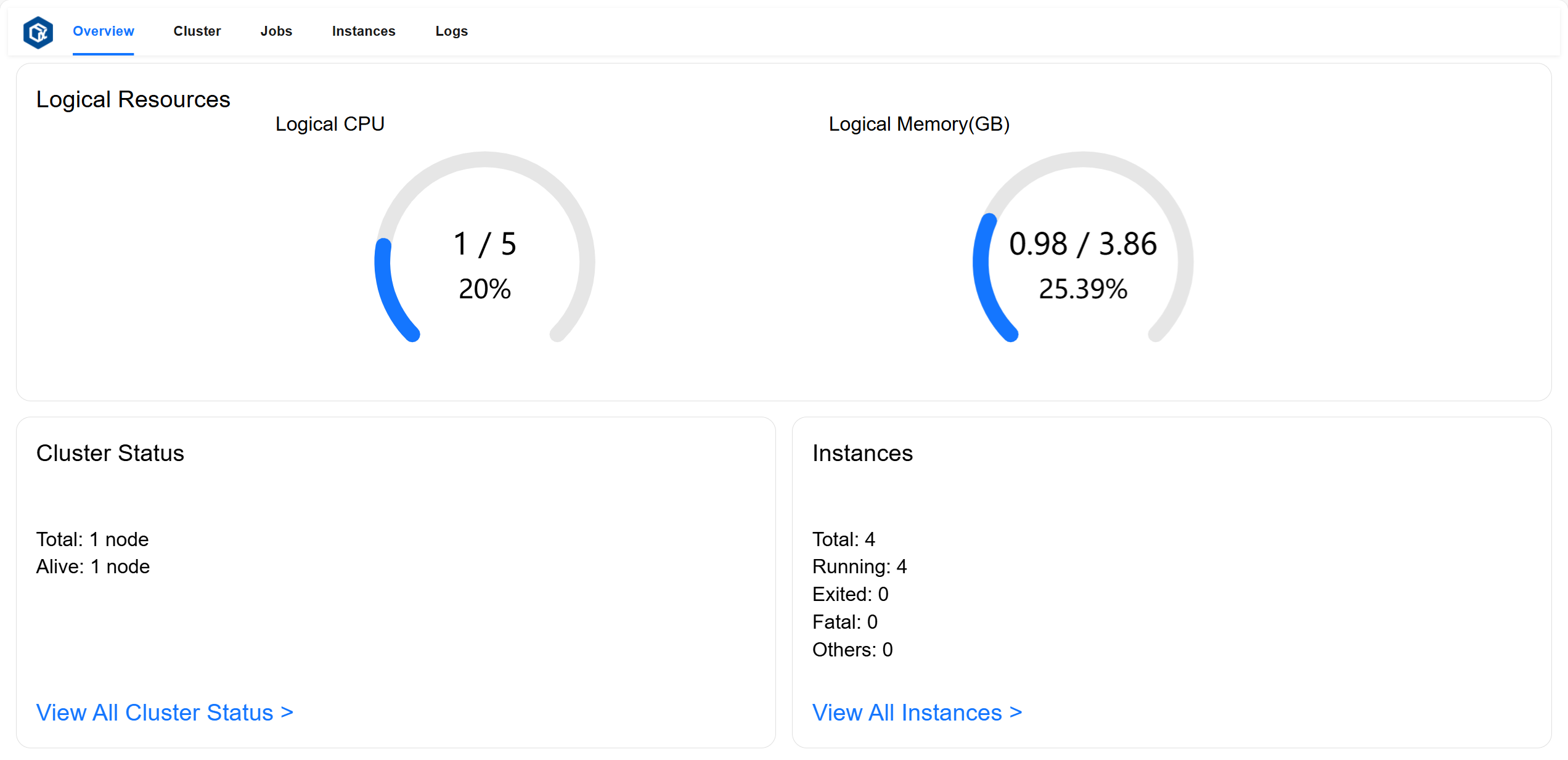 Overview 页面可以查看总逻辑资源占用率、概览所有组件和实例状态。